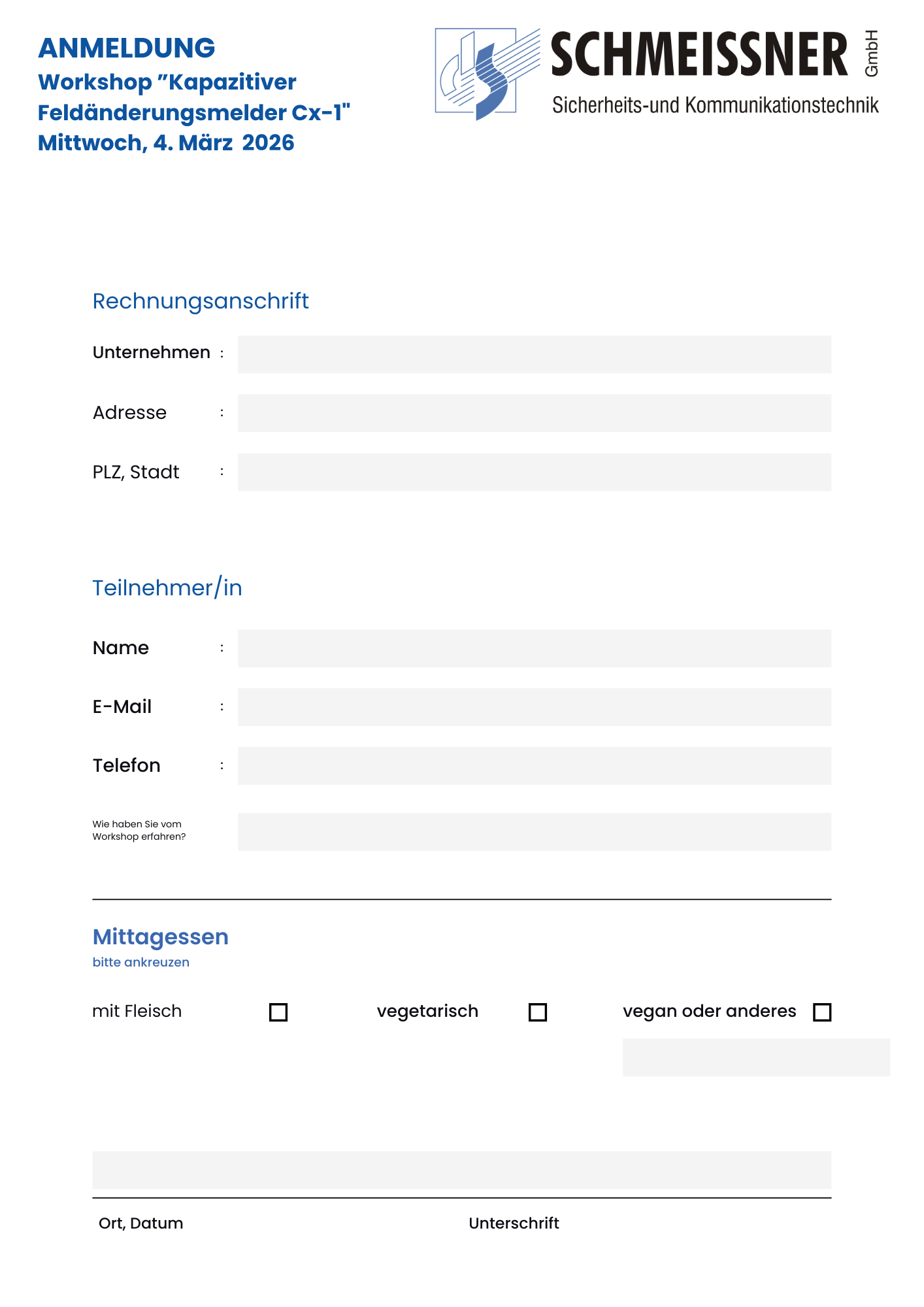 Der Workshop vermittelt theoretische Grundlagen und praktische Kenntnisse zur Anwendung des kapazitiven Feldänderungsmelders Cx-1. Teilnehmende erhalten einen Überblick über Funktionsweise, Einsatzmöglichkeiten und normative Anforderungen. Ergänzend werden praxisorientierte Übungen durchgeführt, um den sicheren und normgerechten Einsatz des Melders zu erlernen.